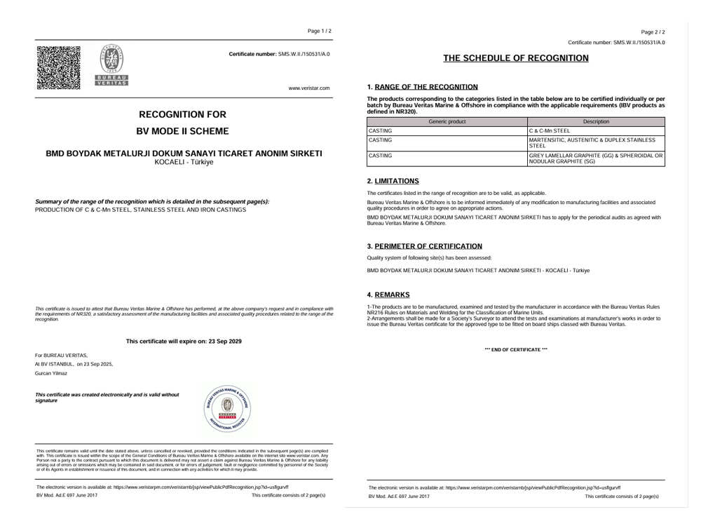 BUREAU VERITAS Mode II Herstellergenehmigungszertifikat
